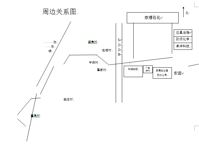 廠區(qū)西側(cè)為博小鐵路線,西側(cè)為盛和熱電有限公司和阿克蘇諾貝爾(博興)有限公司,再向西為勝利三路,自廠區(qū)西側(cè)出入口設(shè)一條道路與經(jīng)濟(jì)開發(fā)區(qū)化工路相通,化工路向南通向205國(guó)道,兩路交叉口西南方向?yàn)椴┡d縣汽車站和協(xié)和醫(yī)院;廠區(qū)北側(cè)自西向東為凱和化工有限公司、董初村、董孫村,東側(cè)為空地,向東為淄東鐵路線,空地東北方向?yàn)槎瓕O村部分民居、再向東為博興五中,空地東南方向?yàn)槲魃项洞澹粡S區(qū)向南依次為淄東鐵路線、引黃濟(jì)青干渠、205國(guó)道、東谷王村。 |